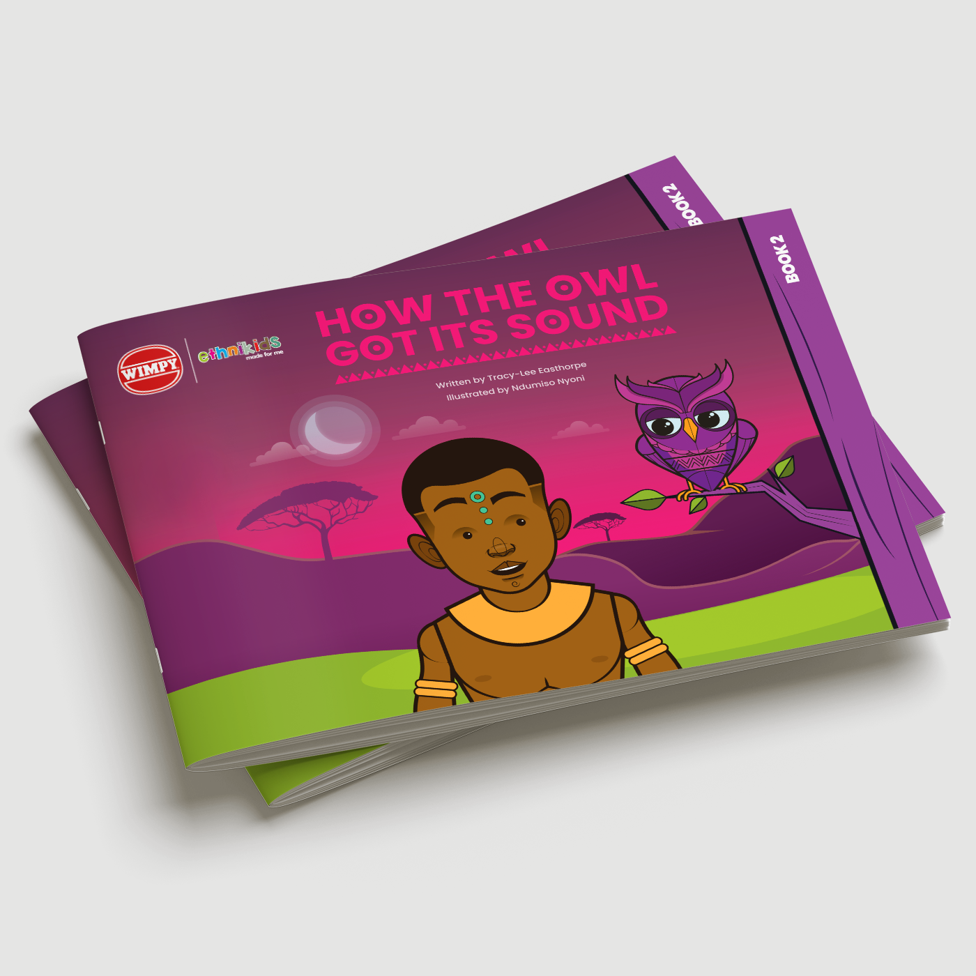 I collaborated with Wimpy and Ethnikids to create illustrations for a children’s book written by Tracy-Lee Easthorpe. The book was titled “How the Owl Got Its Sound” and formed part of a series of 6 unique African folktales. The books were distributed nationwide as part of Wimpy’s children’s meal promotion.